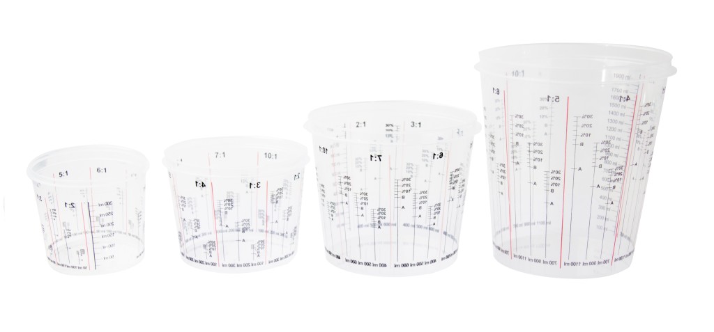 Wichtige Herstellerangaben: Transparente Mischbecher mit praktischen Mischskalen für 2:1 bis 7:1 Verhältniss.