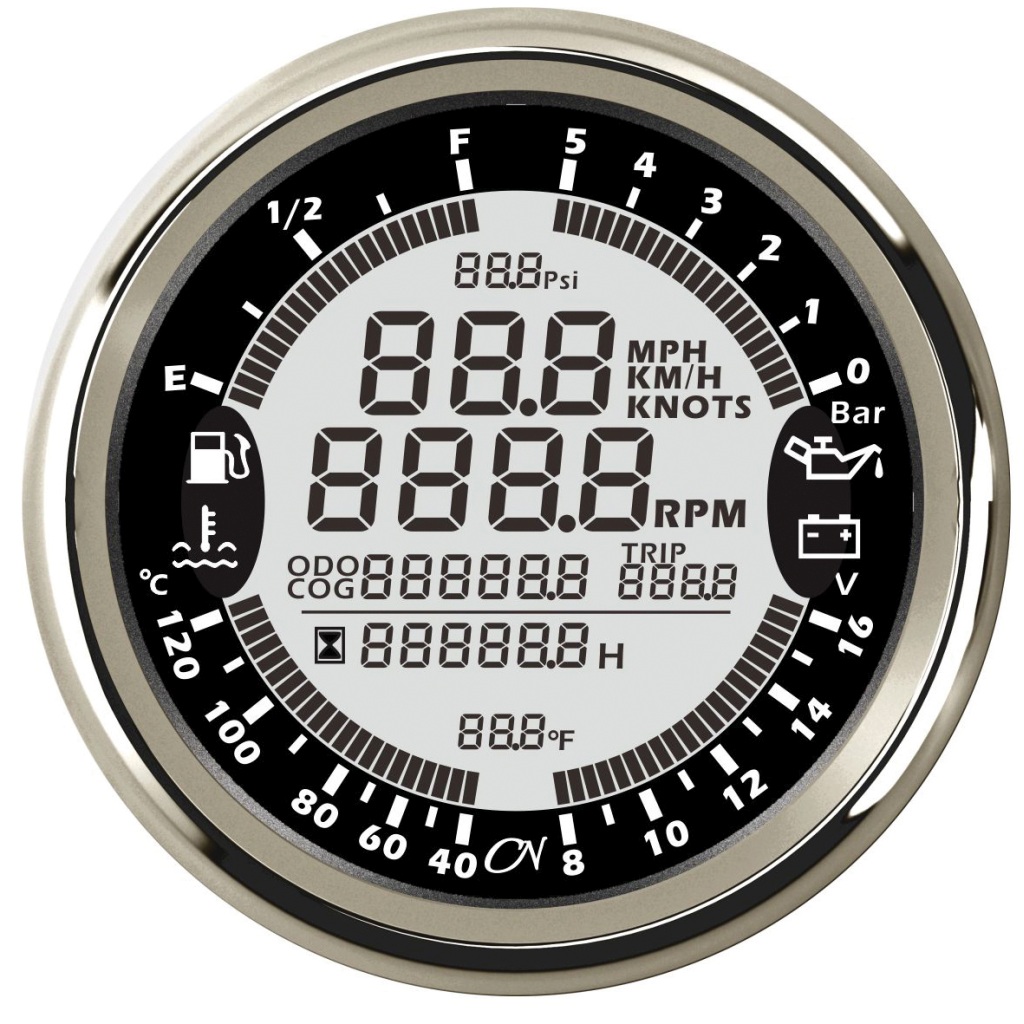 Wichtige Herstellerangaben: CN Instruments; Multimeter 6 in 1; Kraftstoffanzeige; Kühlwassertemperatur (40° – 120°C); Drehzahlmesser; Voltmeter (8 – 16V); Öldruckmesser (0 – 5 Bar); GPS-Tacho (GPS Empfänger enthalten)