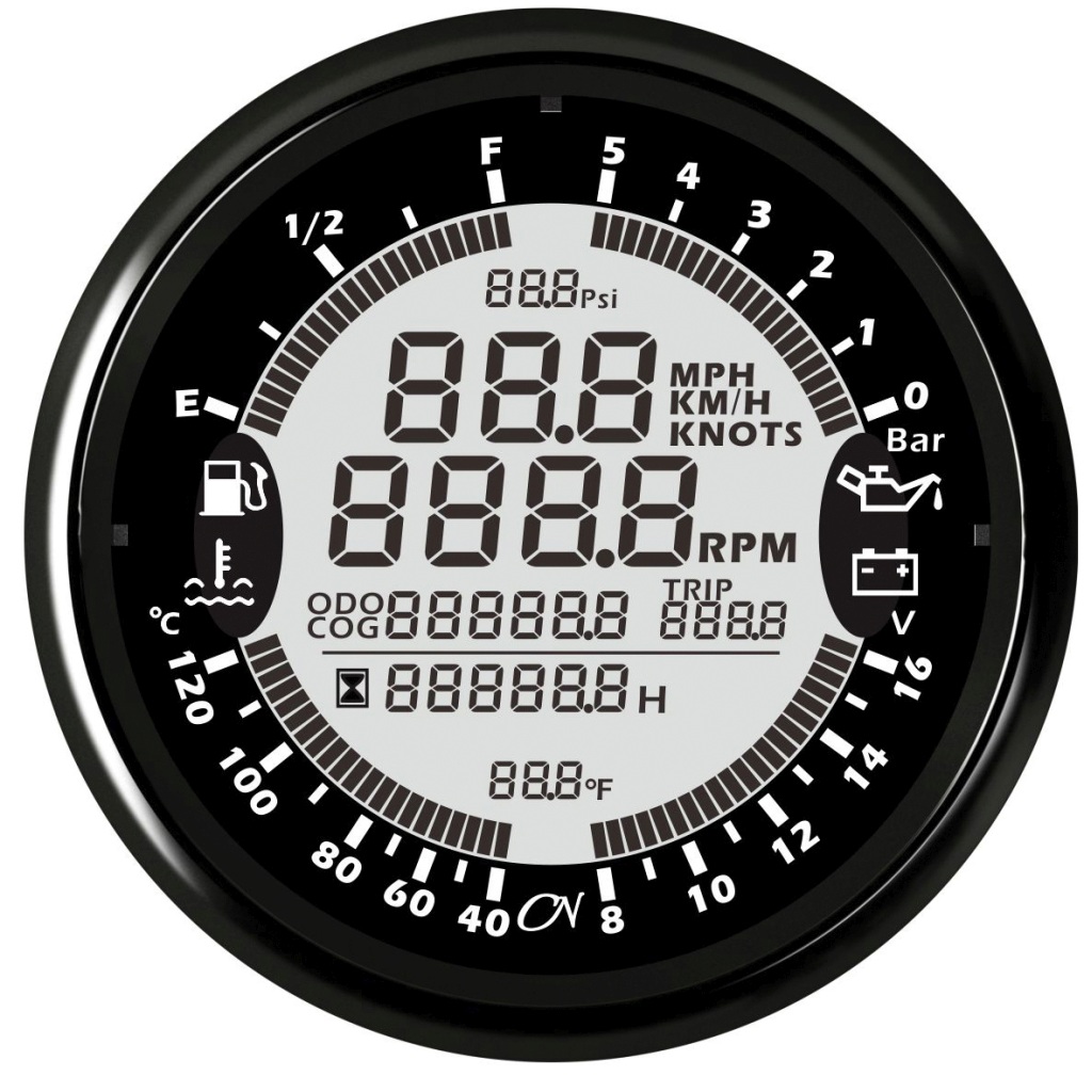 Wichtige Herstellerangaben: CN Instruments; Multimeter 6 in 1; Kraftstoffanzeige; Kühlwassertemperatur (40° – 120°C); Drehzahlmesser; Voltmeter (8 – 16V); Öldruckmesser (0 – 5 Bar); GPS-Tacho (GPS Empfänger enthalten)