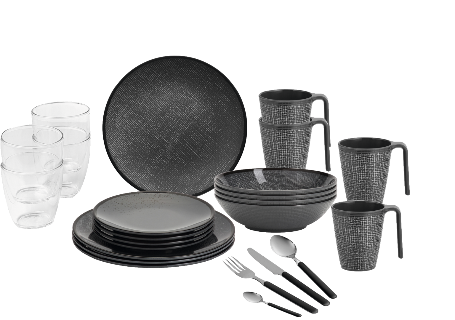 All Inclusive COTTERY. 36-teiliges Set bestehend aus 4 Esstellern ø 25 cm, 4 Suppentellern ø 21 cm, 4 Desserttellern ø 20 cm, 4 Henkelbechern 0,3 l, 4 Gläsern 0,2 l und 16-teiligem Besteckset.