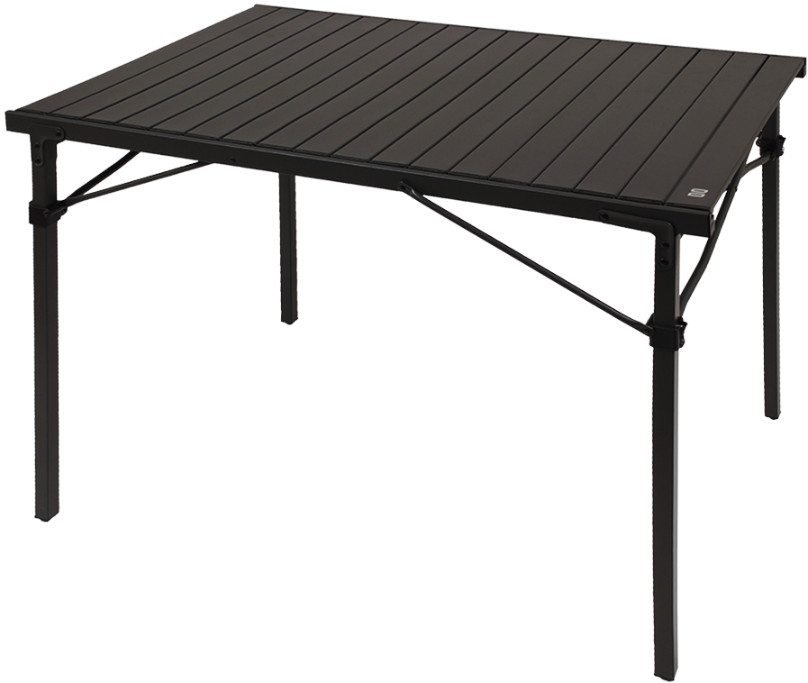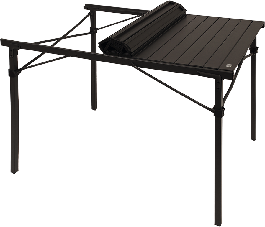 Kompakter, faltbarer und leichter Aluminiumtisch mit dunkelgrauer Pulverbeschichtung und aufrollbarer Tischplatte.