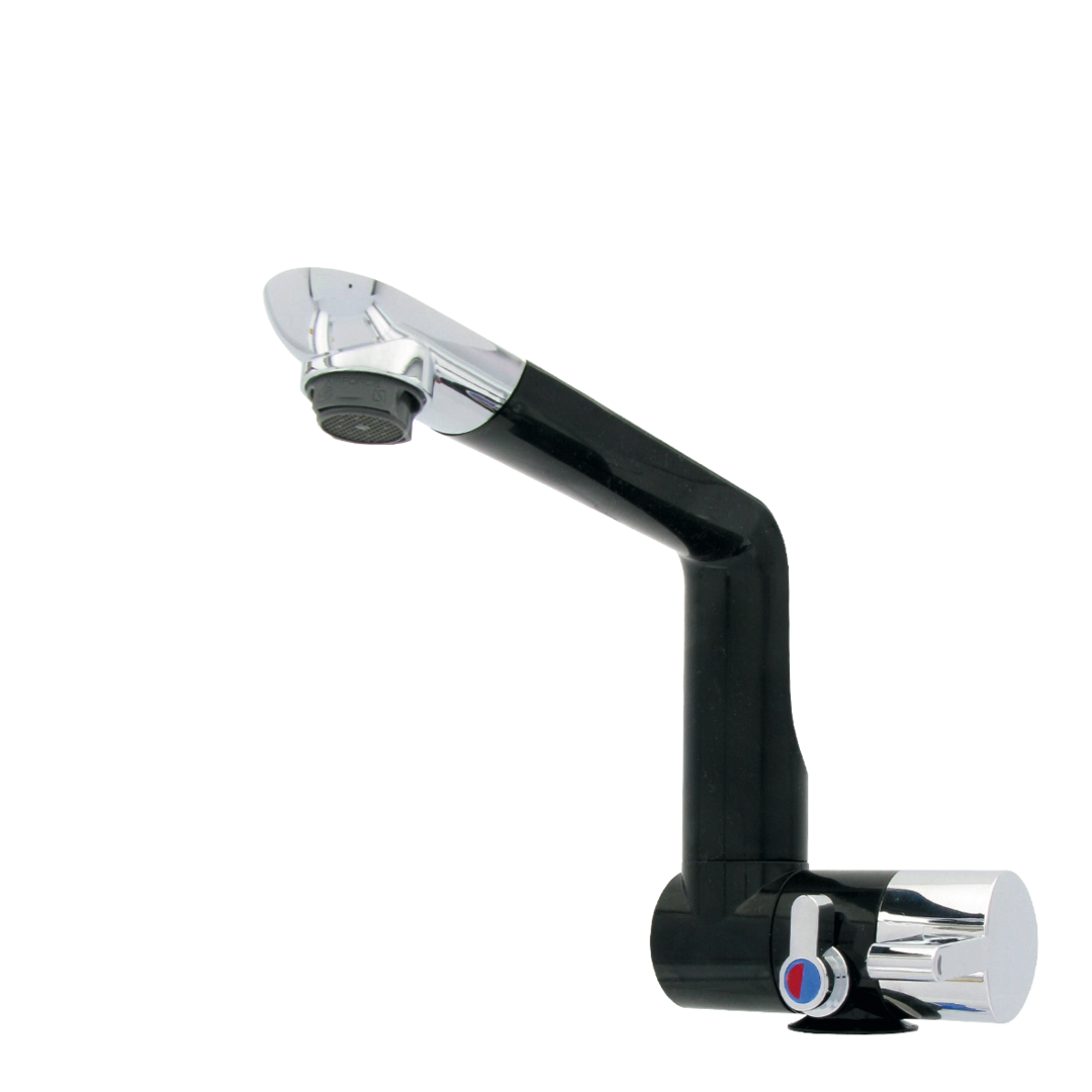 Moderne Kunststoffarmatur. Die hohe Funktionalität unterstreicht der schwenkbare Auslauf, die gut zu reinigende Oberfläche, sowie der ausschraubbare Wasserauslass mit standardmäßig mitgeliefertem Reinigungsschlüssel zum Entkalken und Reinigen. Die Armatur ist druckwasserbeständig bis 1,5 bar. Der Mikroschalter (max. 3 A) ermöglicht den Einsatz in Caravan und Reisemobil. Auslauf drehbar 360° und klappbar. Breite 100 mm, Tiefe 55 mm, Höhe 130 mm, (40 mm Auslauf abgeklappt), Auslauflänge 160 mm. Anschluss Tüllen 8/10 mm, 45°.