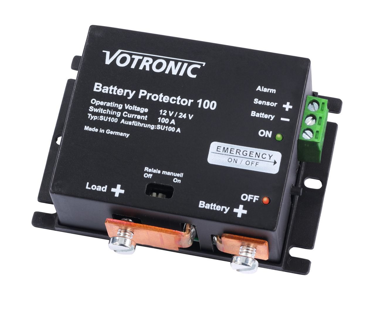 Der Battery Protector 100 verfügt über eine NOT-EIN-Funktion, über die das Gerät jederzeit wieder eingeschaltet werden kann, auch über einen Schalter fernbedienbar. Das Gerät ist für 12 V- auf 24 V-Bordnetze geeignet, arbeitet vollautomatisch und verfügt als Besonderheit über eine intelligente Schaltschwellen-Automatik. Sie erkennt die wechselnde Belastung der Batterie und sorgt für eine optimale Ausnutzung der Batteriekapazität.