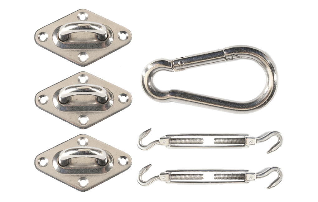 Das Montageset enthält einen oder zwei Karabinerhaken, zwei Schraubenschlüssel und drei oder vier Befestigungsplatten mit Ösen.