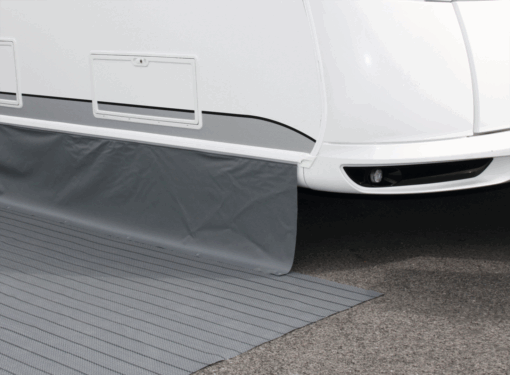 Wind- und Sichtblende am Caravan. Mit hoch belastbaren, eingeschweißten und nicht rostenden PVC-Ösen. Gefertigt aus Weichfolie mit Leinenstruktur mit PVC-Keder.