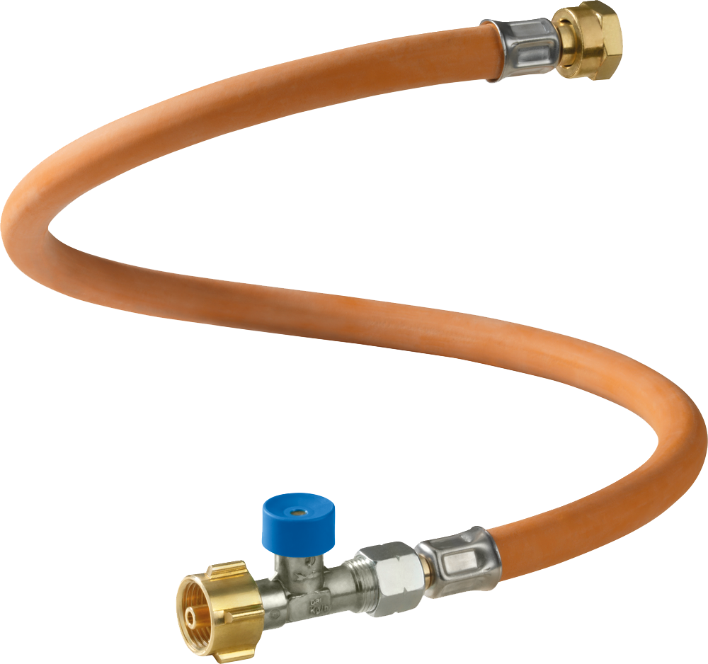 Hochdruck-Schlauchleitung mit Schlauchbruchsicherung zum Anschluss an alle wandmontierten Niederdruckregler mit Eingang AG M20 x 1,5