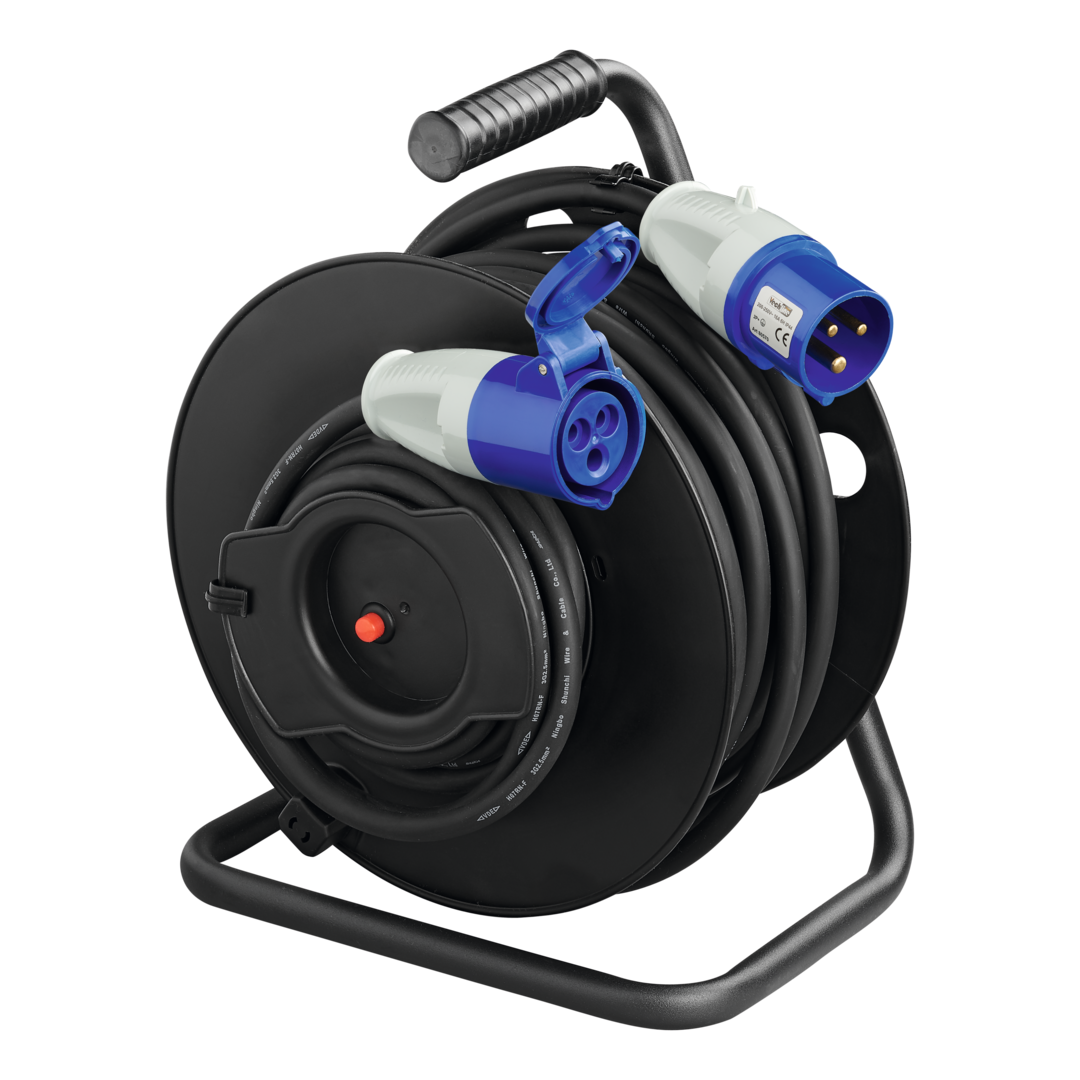 Mit CEE-Stecker 230 V/16 A und CEE-Kupplung 230 V/16 A, spritzwassergeschützt.