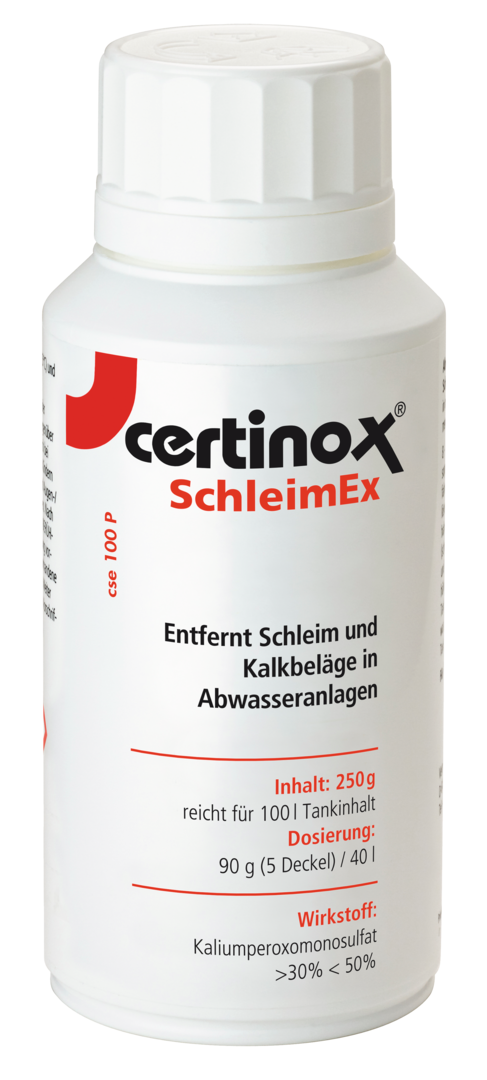 certinox® SchleimEx. Übelriechende Beläge im Abwassertank werden mit Aktivsauerstoff und Fettlöser gründlich entfernt.