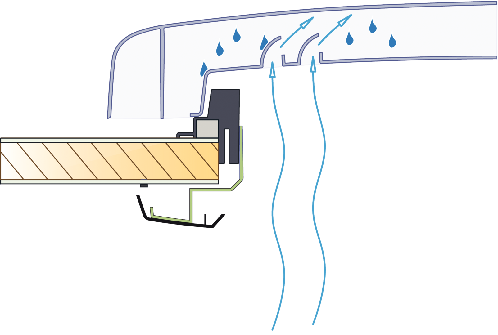 Für Dachstärken getöntes Haubenmaterial. Moderner Innenrahmen mit Doppelplissee. Rahmenfarbe Weiss.
