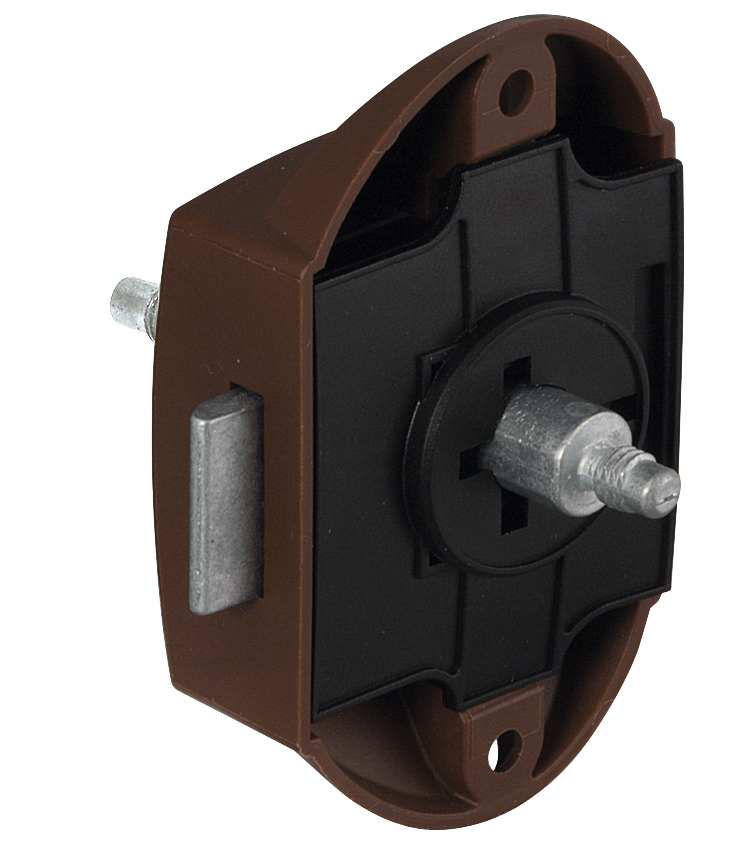 Aus Kunststoff. Farbe Braun. Lieferumfang: 1 Drehstangenschloss, 1 Paar Fanghaken. Ohne Schnappriegel.