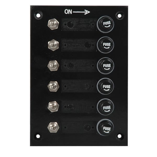 Schwarzes Schaltpanel für die Beleuchtung mit 6 Schaltern und 6 Sicherungen.