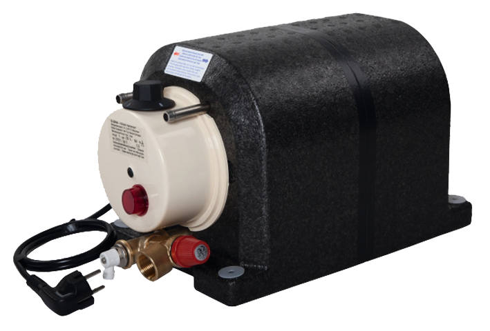 ELGENA Boiler Nautic-Compact. Mit thermostatischer Regelung von +30 °C bis +85 °C, Überhitzungsschutz und Frostwächter. Vollisolierte Ausführung, Warmwasser wird bis zu 48 Stunden gespeichert. Kessel aus hochwertigem Edelstahl V4A gefertigt. Anschluss 230 V/660 W (3 A). Mit Sicherheits- und Wasserablaufventil. Für Tauch- und Druckpumpen geeignet.