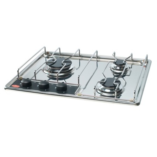 Gaskochfeld im Edelstahlgehäuse, ausgestattet mit 3 Brennern und Zündsicherung. CE- und DVGW-geprüft. Brennerleistung: 1,0, 1,75 und 2,5 kW. Anschlussdruck: 30 mbar.