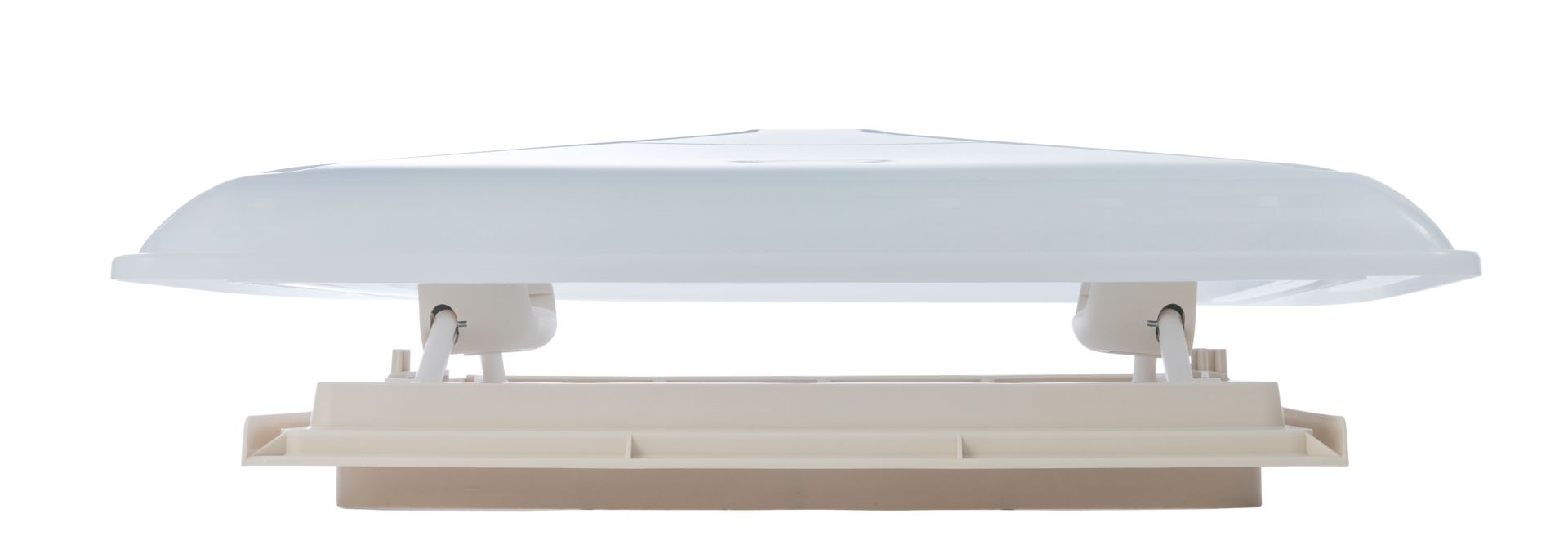 Dachausschnitt 400 x 400 mm. Für Dachstärken 24 – 46 mm. Mit Lüftungshaube 480 x 480 mm, Milchglas, Teleskopausstellern, Tastenverriegelung. Rahmenfarbe beige.