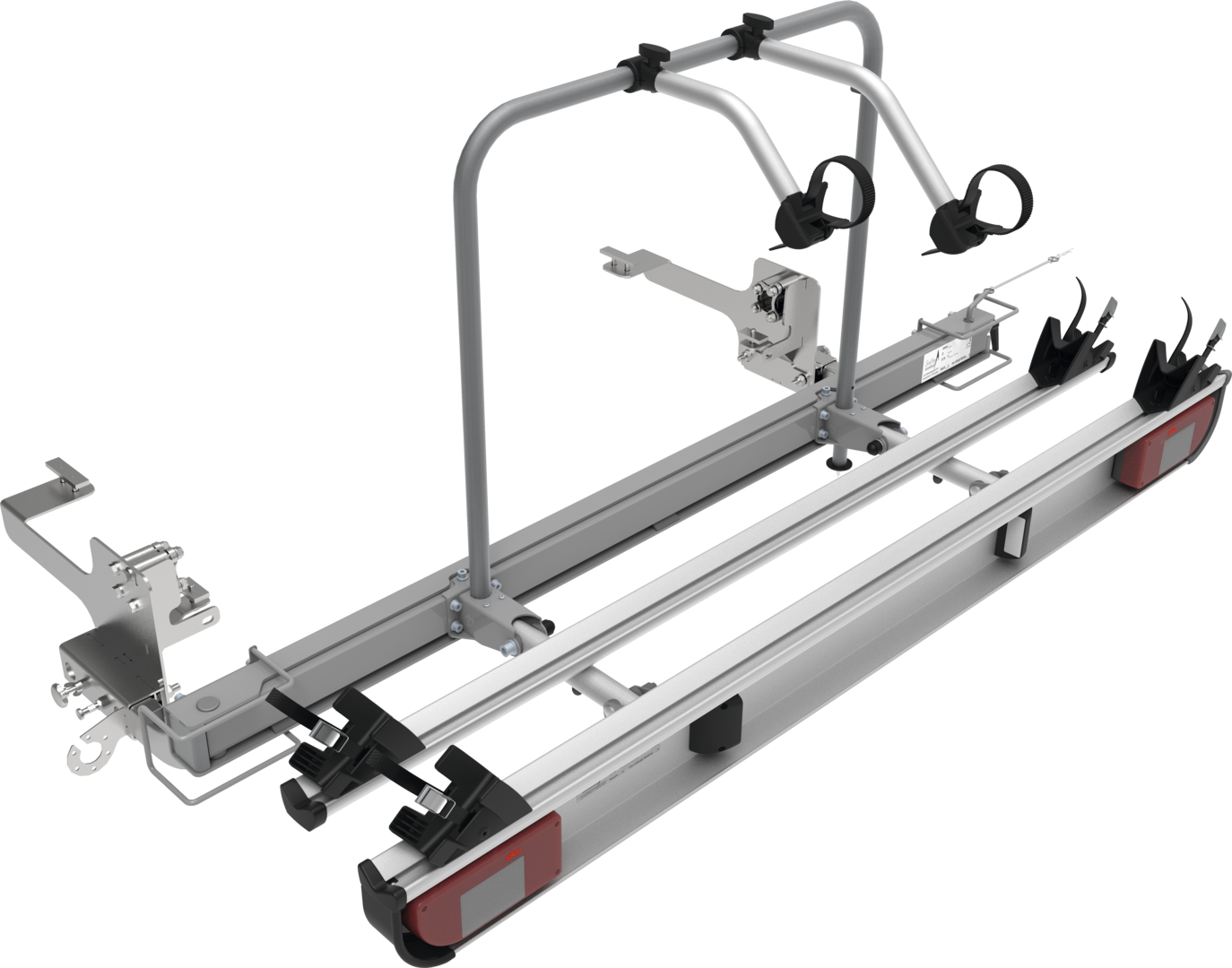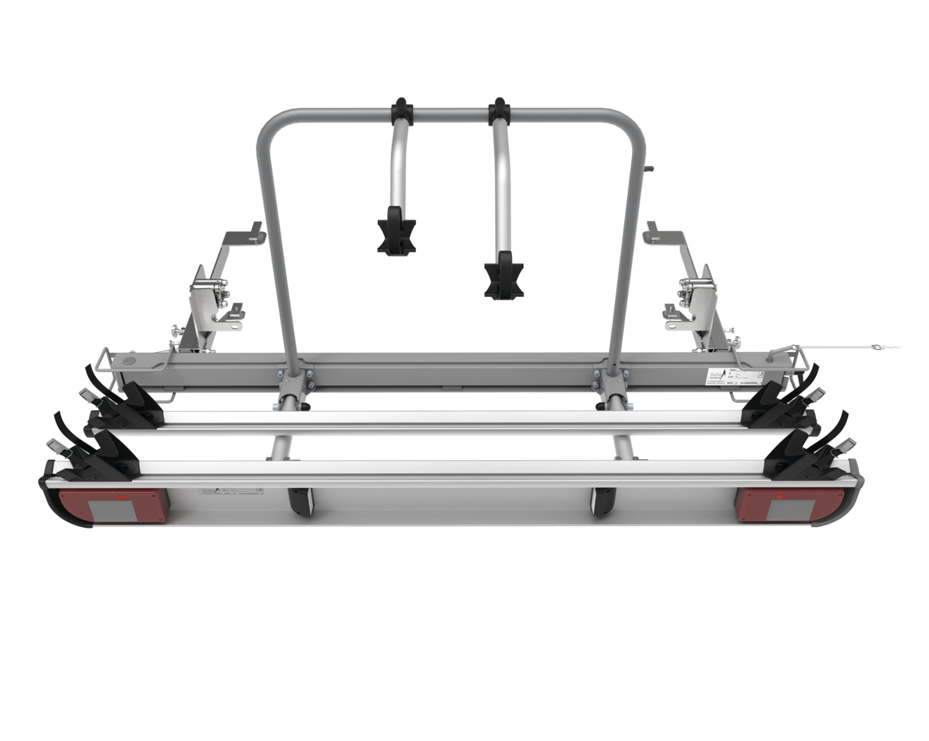 Für Fahrzeuge mit Radstand 345 und 403,5 cm. Basisträger aus Stahl/Aluminium. 2 Fahrradschienen 170 cm lang mit je 2 Radschalen und 2 Spanngurten, 2 Befestigungskrallen.