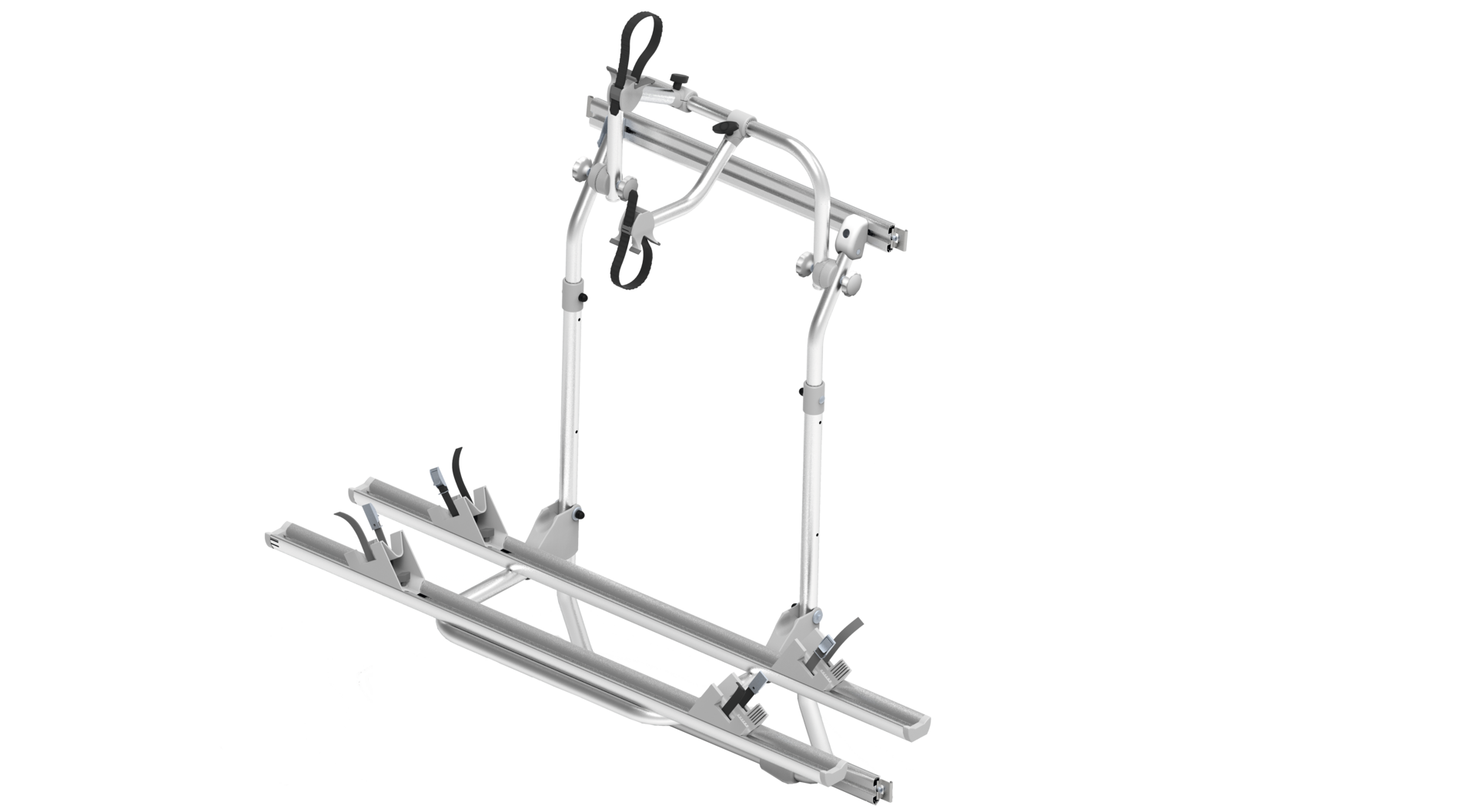 Grundrahmen aus eloxiertem Alu-Rohr, 2 Aluminium Fahrradschienen 137 cm lang mit je 2 Radschalen inkl.. 2 Ratschenbänder, 2 Befestigungskrallen, 2 Spannschienen zur Montage am Fahrzeug. Max. Beladung bis zu 2 Fahrräder. Zuladung max. 35 kg.