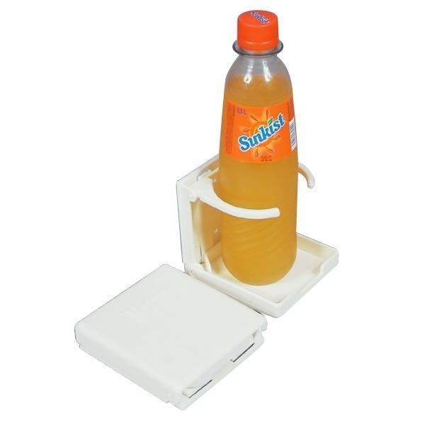 Praktischer Dosen-/Flaschenhalter aus weißem Kunststoff. Der Halter lässt sich bündig an die Wand klappen. Die Befestigung erfolgt mit 4 Schrauben, die nicht mitgeliefert werden.