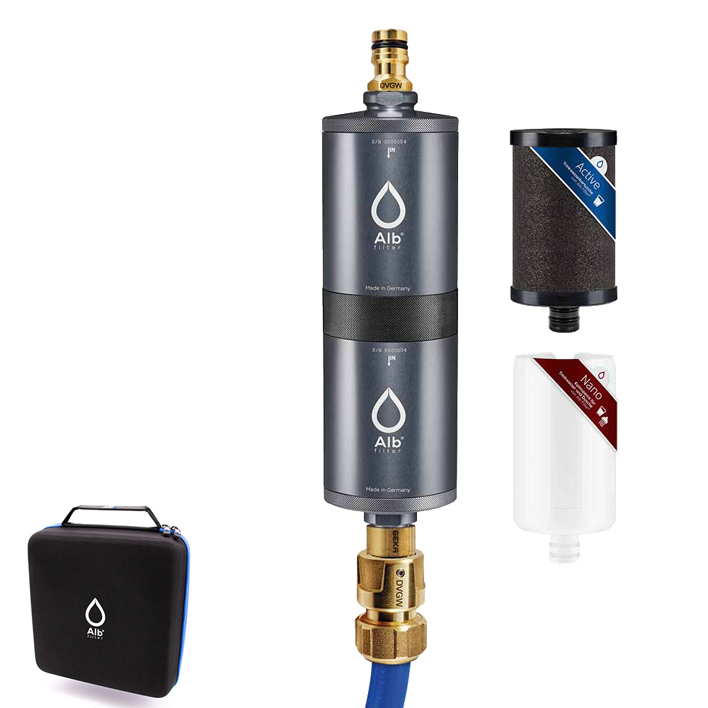 Mit den Alb Filter MOBIL-Sets zapfen Sie ganz einfach Wasser aus den meisten Quellen weltweit. Ein Schlauch mit DVGW Zulassung, GEKA® Hahn- und Gerätestecker sowie GEKA® Schlauchverbinder liegen dem Set bei. Die Anschlüsse sind trinkwasserkonform und 100% kompatibel zu Gardena®. Verfügbar in den Varianten ACTIVE, NANO und FUSION. Die FUSION Variante vereint die Active und Nano Kartusche in einem kompakten, zuverlässigen System für die volle Filterleistung. Weitere Informationen zu den Kartuschen im Infokasten.