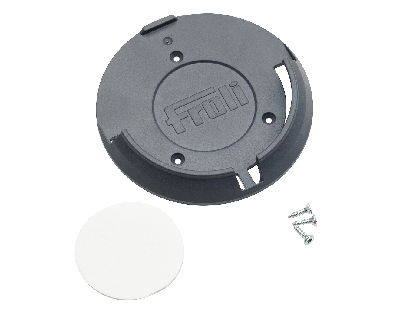 Lieferumfang: Halter für Schutzkappe, ø 100 mm, schiefergrau, 3 Schrauben und 1 Klebepad.