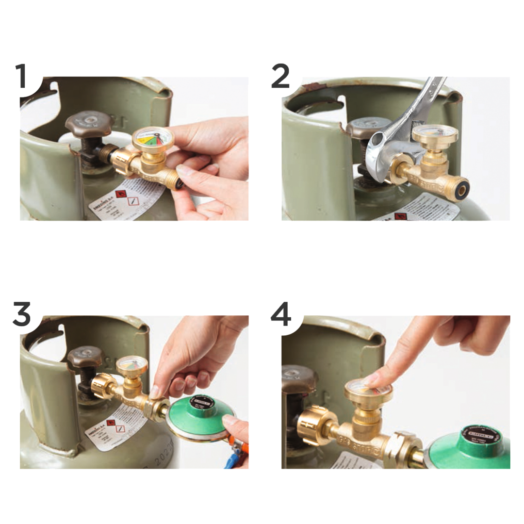 Den GasStop an die Gasflasche anschließen. GasStop mit entsprechendem Werkzeug festziehen. Den Regler (keinen mit Überströmventil)