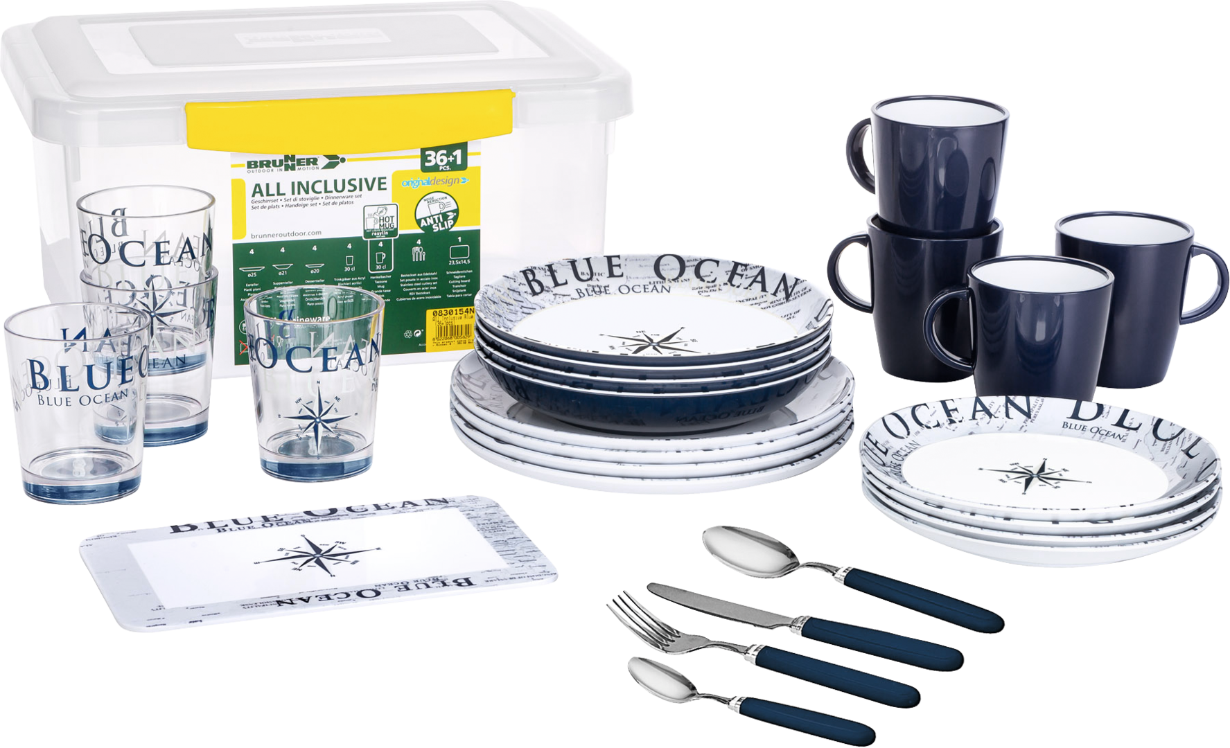 All-Inclusive-Box. 36-teiliges Set in robuster Transportbox bestehend aus 4 Esstellern ø 25 cm, 4 Suppentellern ø 21 cm, 4 Desserttellern ø 20 cm, 4 Henkelbechern 30 cl, 4 Acryl-Trinkgläsern 30 cl sowie einem 16-teiligen Besteckset (je 4 x Löffel, Gabel, Messer, Teelöffel).