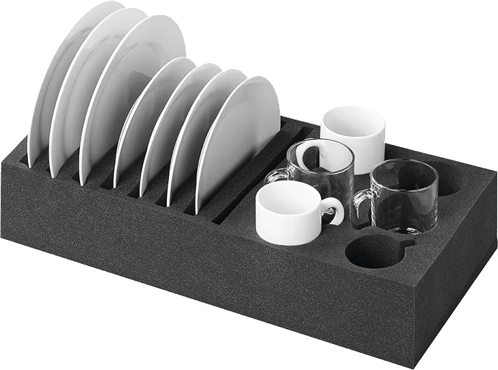 Geschirrhalter für den Einsatz in Schränken. Geeignet für 8 Teller und 6 Tassen. Tellerausschnitte (LxB) 23 x 1,4 cm,