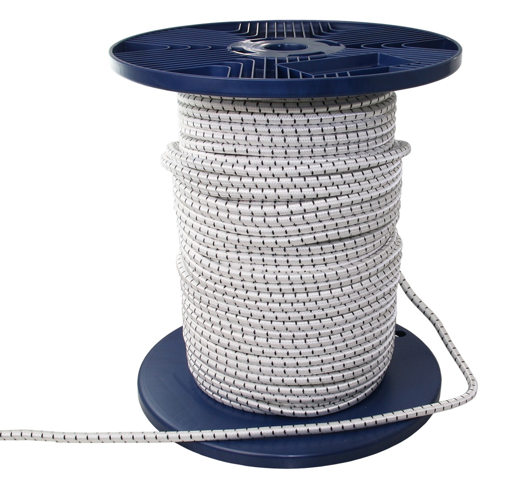 Elastische Gummileine mit Polyestermantel, 4 mm stark, weiß und auf 100 m konfektioniert, zum Spannen, Sichern und flexiblen Fixieren an Bord oder am Trailer.