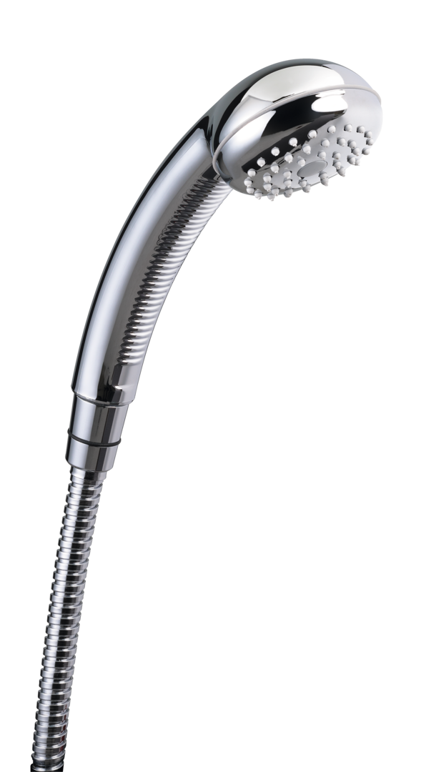 Handbrause ORION. Anschluss ½“. Mit eingebautem Strahlregler aus weichem Kunststoff, besonders leicht von Kalk zu befreien. Ohne Brauseschlauch. Farbe Chrom.