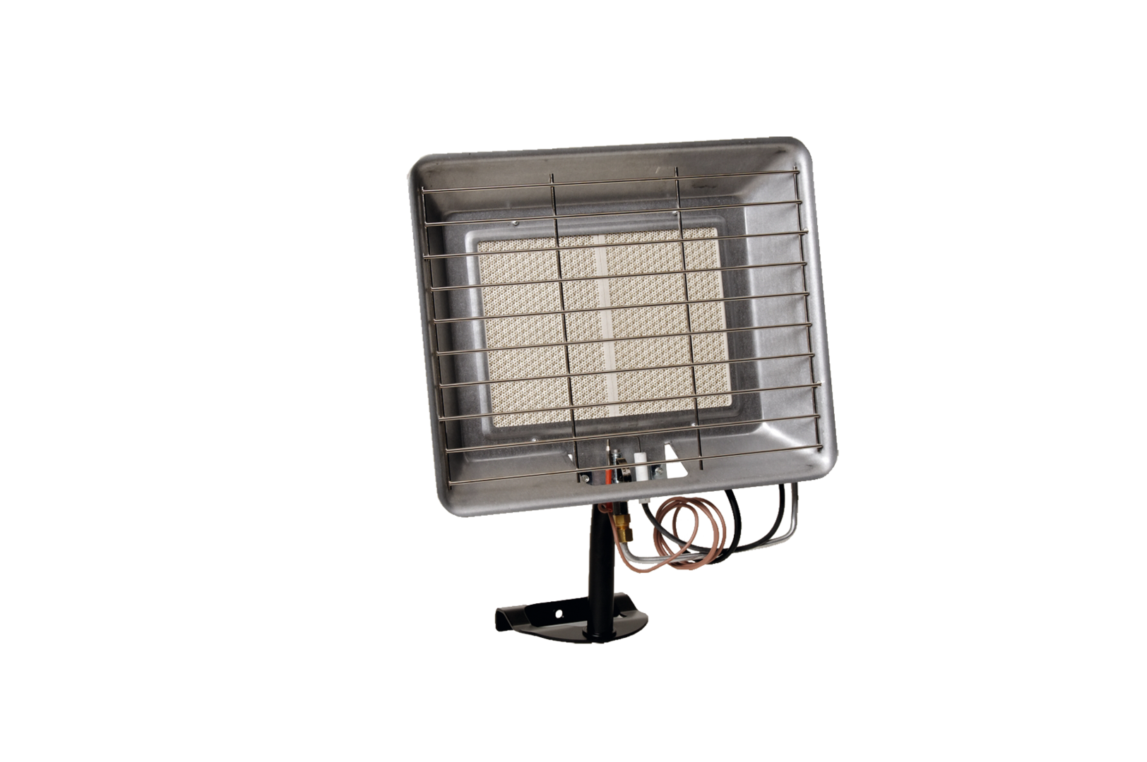 Kompakter Gas-Heizstrahler zur Direktmontage an 5 und 11 kg Gasflaschen. Komplett mit Druckregler, Gasschlauch, Flaschenhalterung und Schutzgitter.
