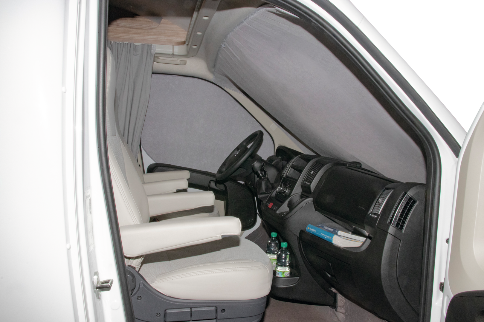 Bei Fahrzeugen mit eingebauter Innenverdunkelung (MV) werden die Türfenstermatten zwischen Rahmenkonstruktion der Verdunkelung und der Scheibe eingesteckt. Sie schließen ringsum ab.