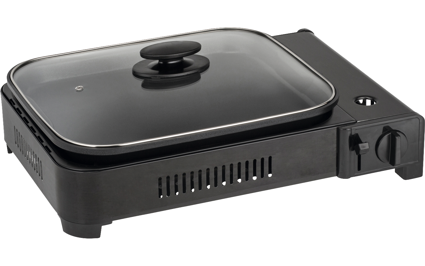 Zusätzlich zur Grillplatte aus Aluminiumdruckguss mit Antihaftbeschichtung ist eine große Bratpfanne mit Glasdeckel im Lieferumfang enthalten. Inklusive Transporttasche. Leistung 2,2 kW.