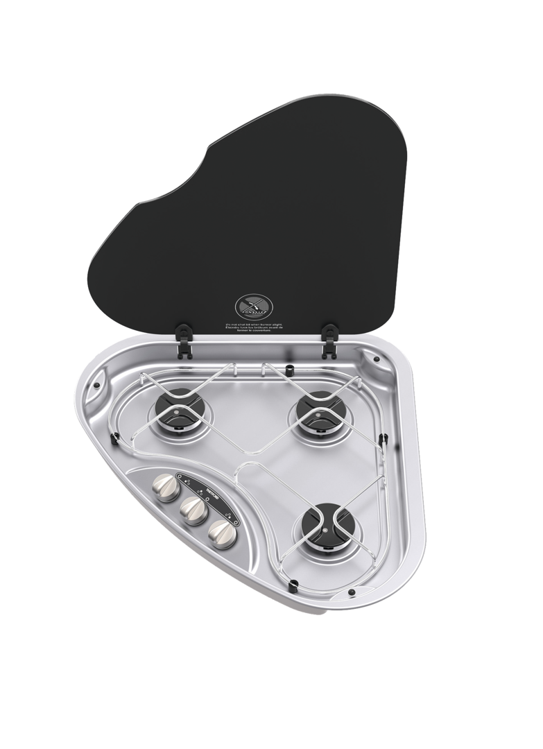 Ein dreieckiges Kochfeld aus Edelstahl, das perfekt zur Spüle der Basic Line 33 passt.