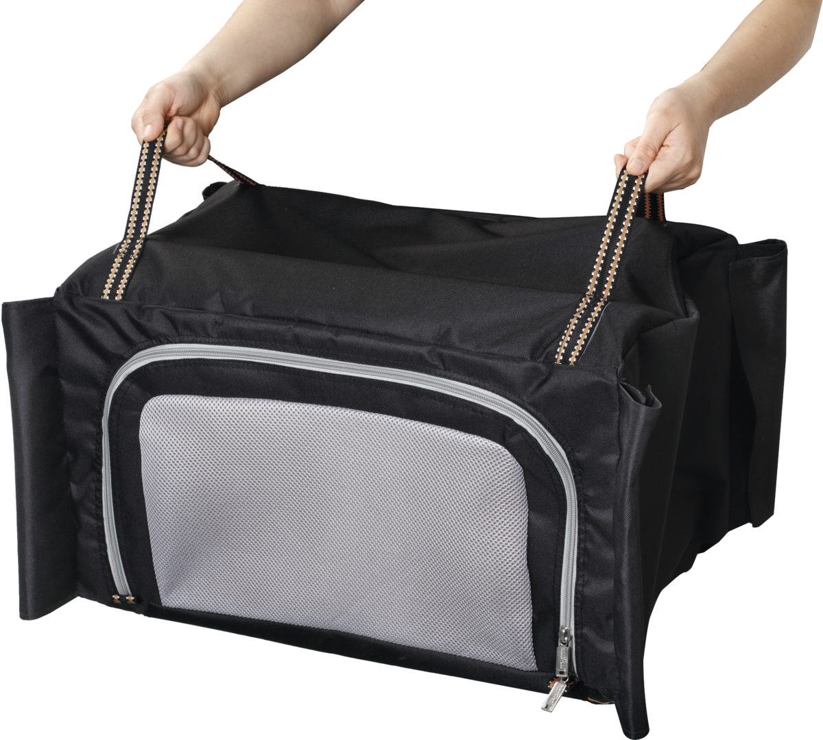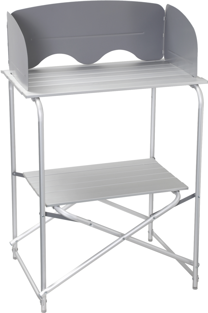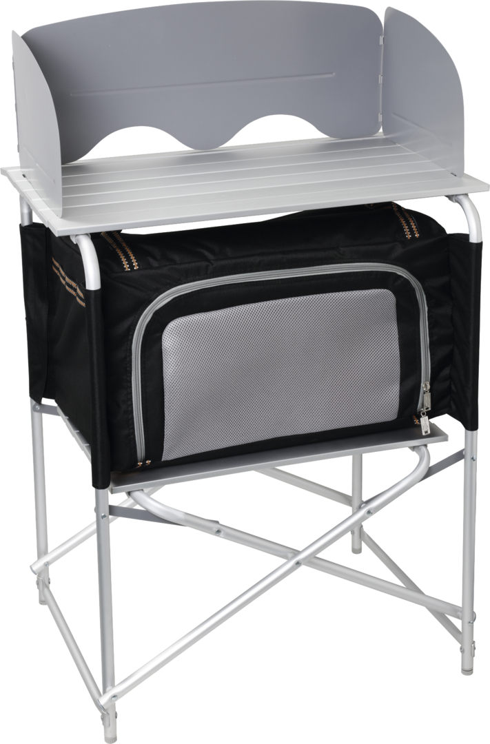 Küchenbox SNACK BASIC. Klappbare Küchenbox mit rollbarer Arbeitsplatte, unterer Ablage mit abnehmbarem Stoffschrank und nützlichem Wind- und Spritzschutz.