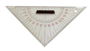 Kurs- und Anlegedreieck aus Plexiglas 2mm, mit Griff und Markierungsloch. Winkelteilung 360°-1°, Länge der Hypothenuse 250mm