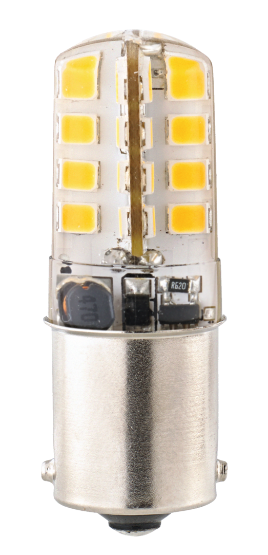Ersatz für 25 W Halogen mit Sockel, BA15d, Verbrauch 2,5 W, Lichtstrom 200 lm, warmweißes Licht 2.700 K, EEK F.