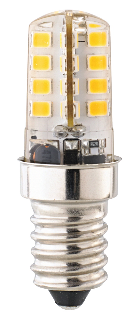 Ersatz für 25 W Halogen mit Sockel E14, Verbrauch 2,5 W, Lichtstrom 200 lm, warmweißes Licht 2.700 K, EEK F.