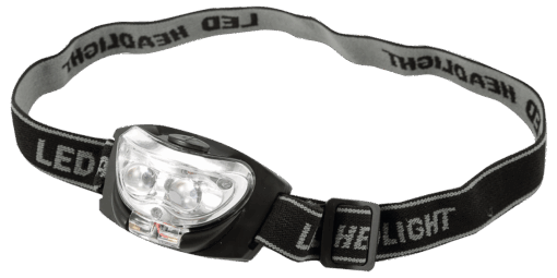 . LED-Stirnlampe mit rotem (1 x) und weißem Licht (2 x), Lichtstrom 18 lm, Leuchtdauer 5 – 6 h.