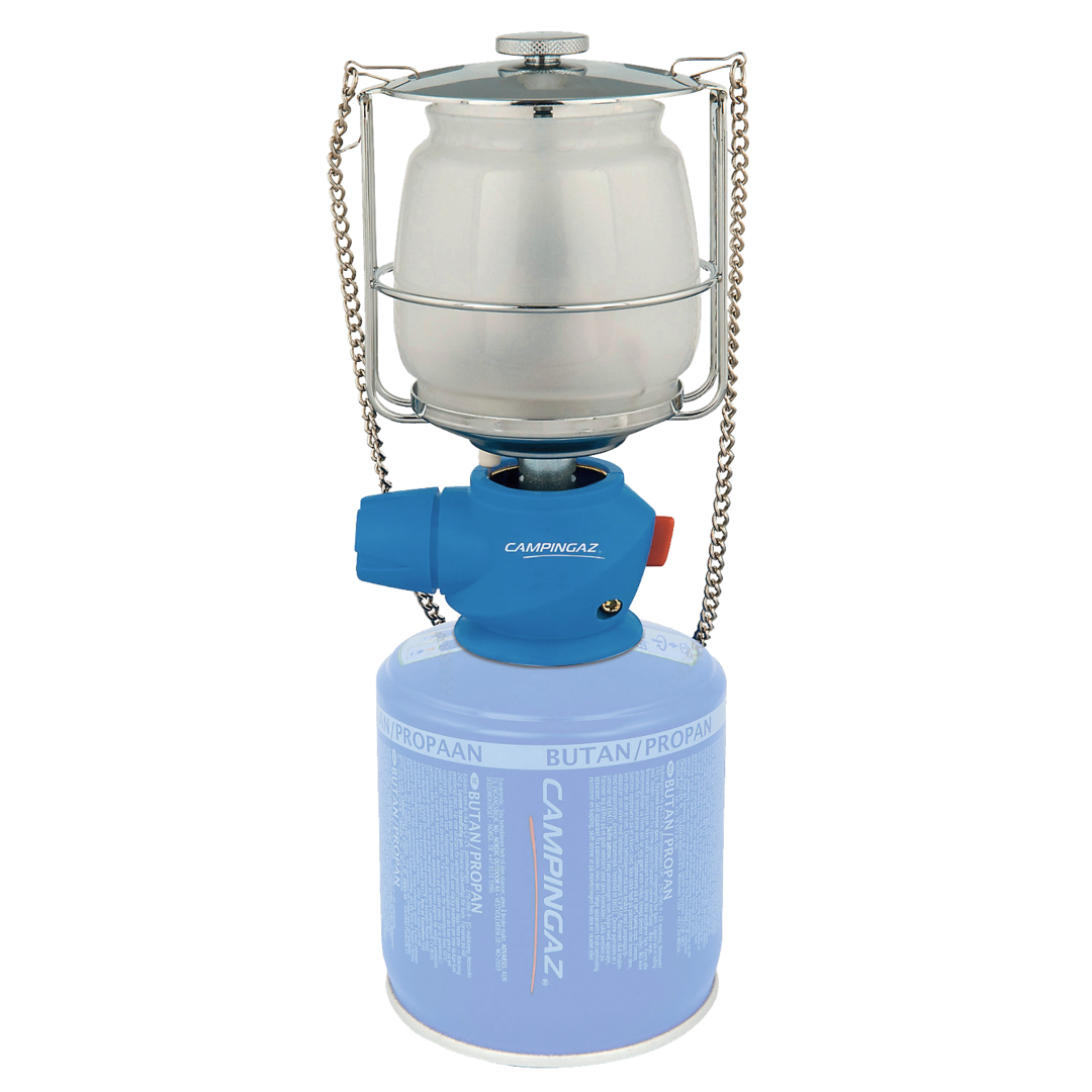 Leuchte Lumostar® PLUS PZ. Mit Piezozündung und Easy Clic-Anschluss für Ventilkartuschen. Mit Trage- und Hängekette. Leistung 80 W. Verbrauch 38 g/h. Brenndauer 6,5 – 12 h.