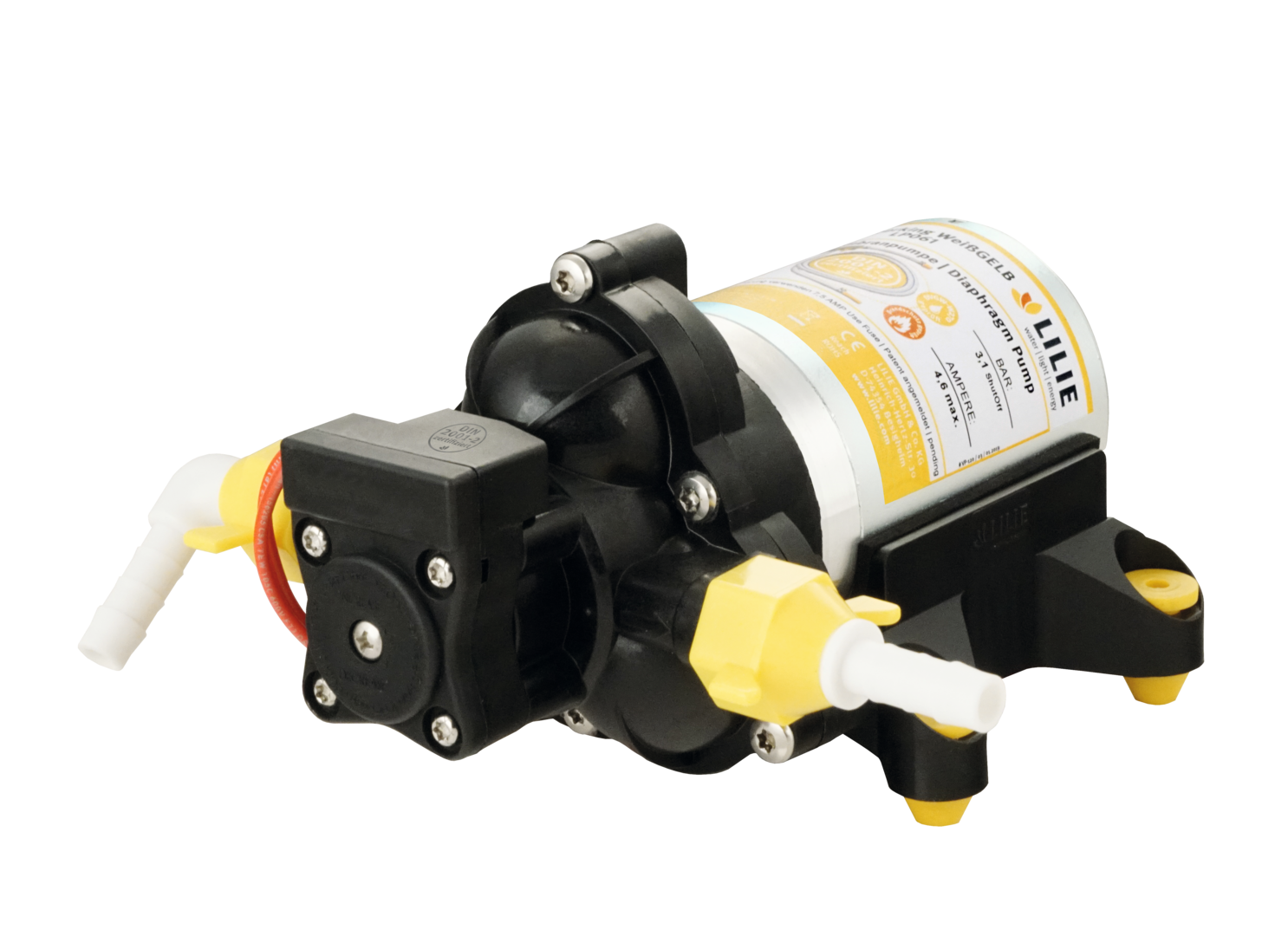 LILIE CLASSIC-Serie WHISPER-KING. Extrem leise Druckwasserpumpe. Trockenlaufsicher. Spannung 12 V. Max. Förderleistung 10,0 l/min. Abschaltdruck 3,1 bar. Max. Stromaufnahme 5,9 A. Max. Ansaughöhe 3,1 m.
