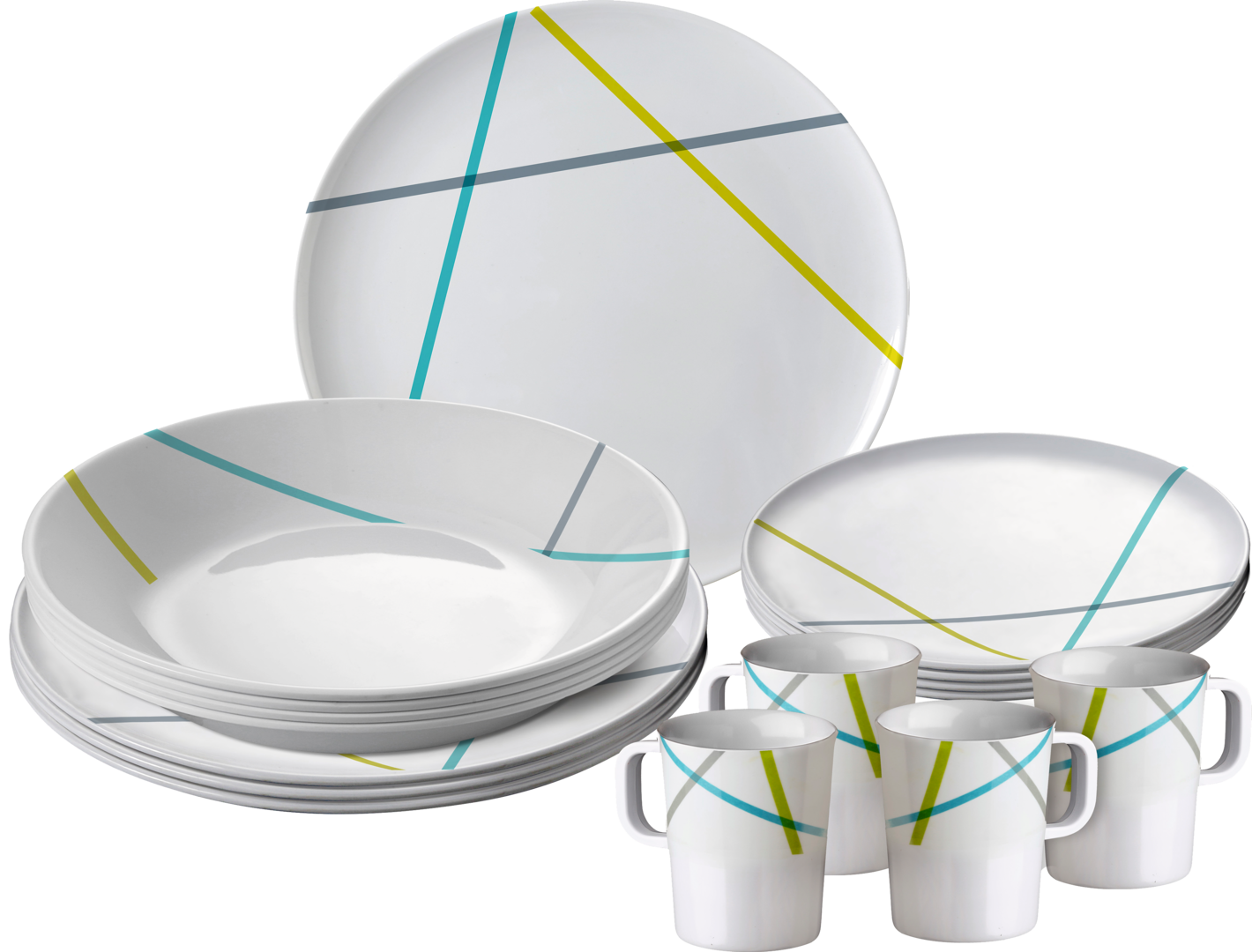 Melamin-Set LINES. 16-teiliges Geschirrset aus hochwertigem Melamin. Spülmaschinengeeignet, bruchunempfindlich, geruchs- und geschmacksneutral und lebensmittelecht. Nicht mikrowellengeeignet! Bestehend aus 4 Henkelbechern 35 cl, 4 Esstellern ø 25 cm, 4 Desserttellern ø 20 cm und 4 Suppentellern ø 22 cm.