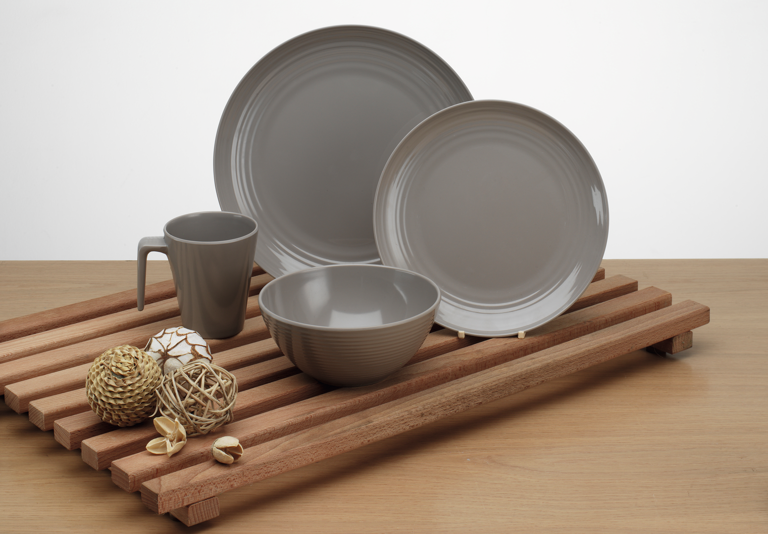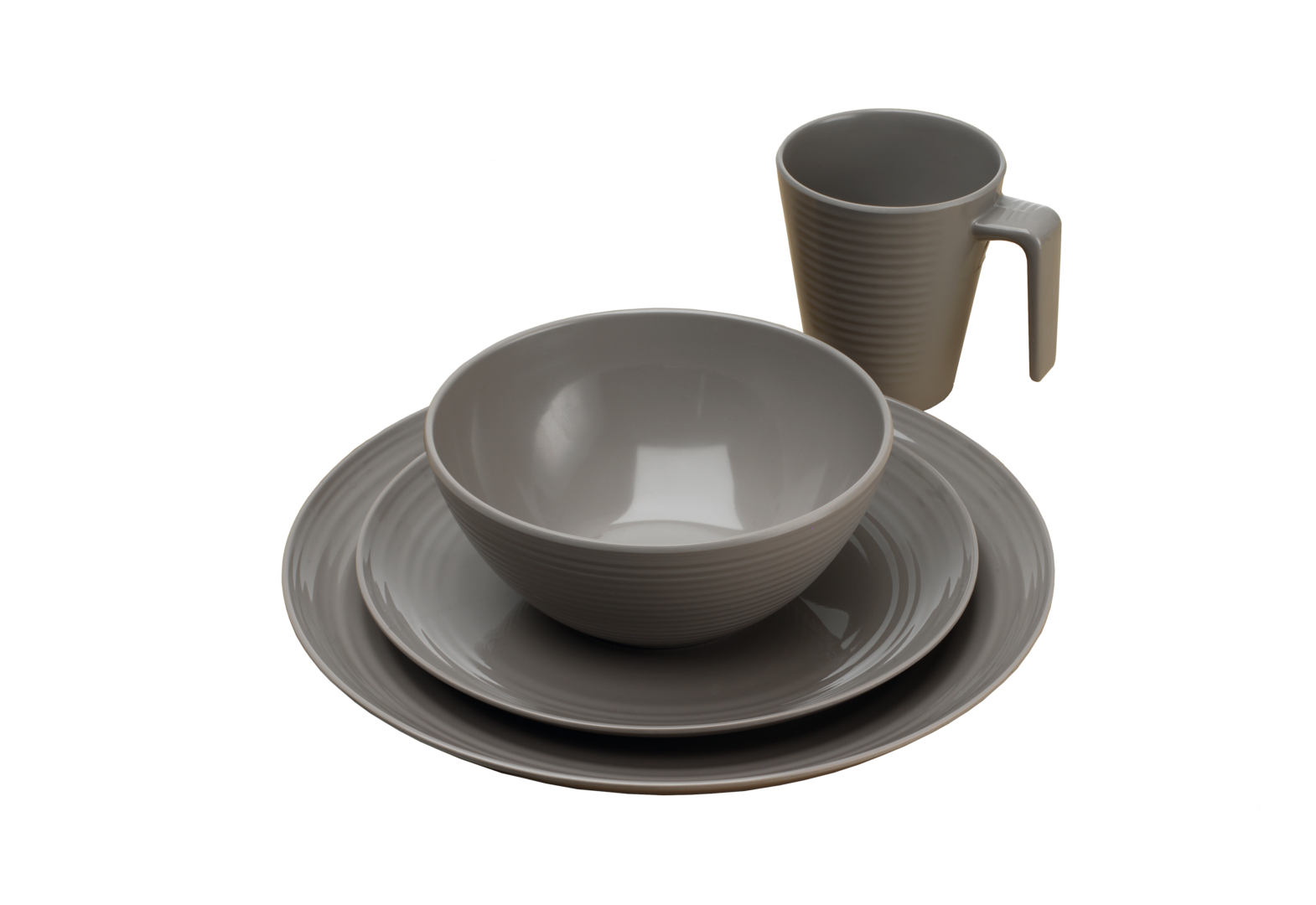Melamin-Set SERAMIKA LATTE. 16-teiliges Geschirrset bestehend aus 4 Esstellern, 4 Desserttellern, 4 Suppenschüsseln und 4 Henkelbechern.