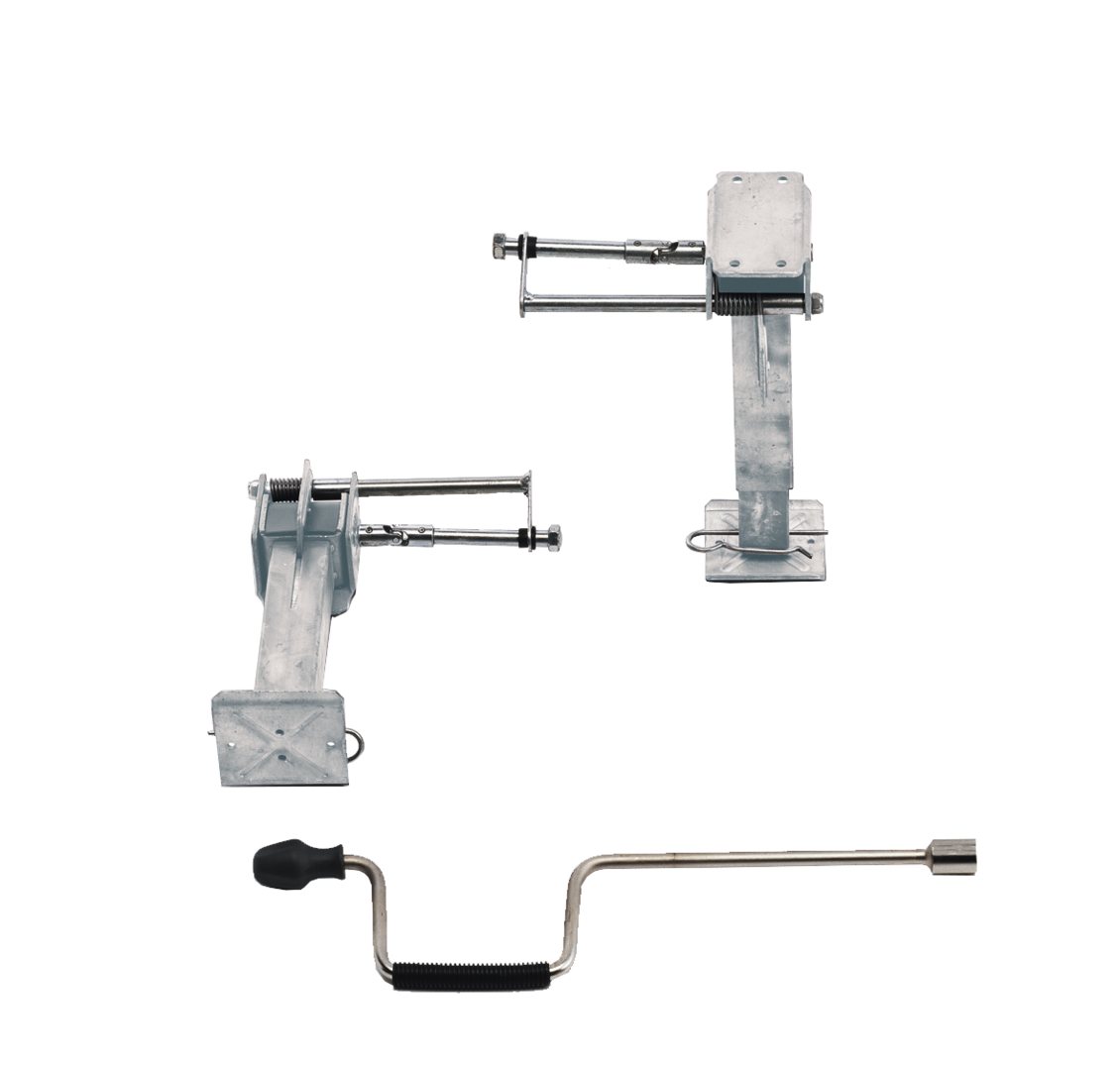 Serienmäßig mit verlängerter Kurbel (850 mm). Der Abstand zum Boden kann mittes Stecksystem schnell und effektiv angepasst werden. Stützen für die Hinterachse mit Universal-Befestigungswinkel. Maximale Hebekraft pro Stütze : 500 kg.