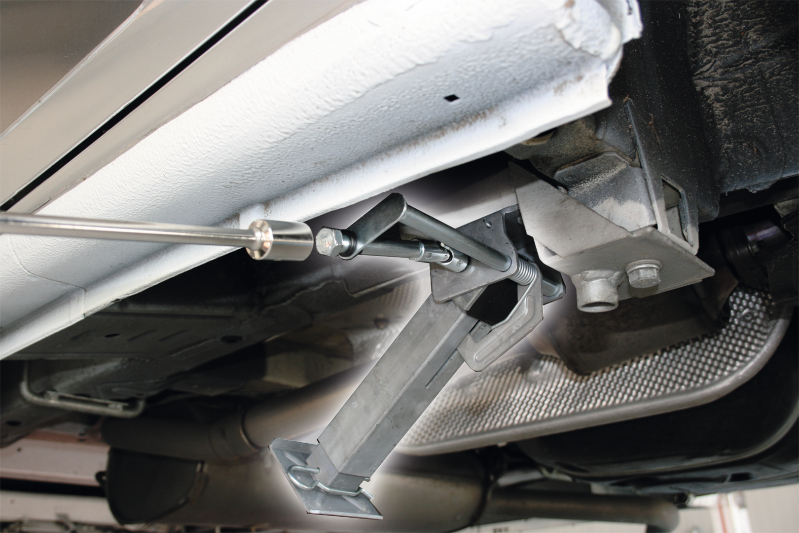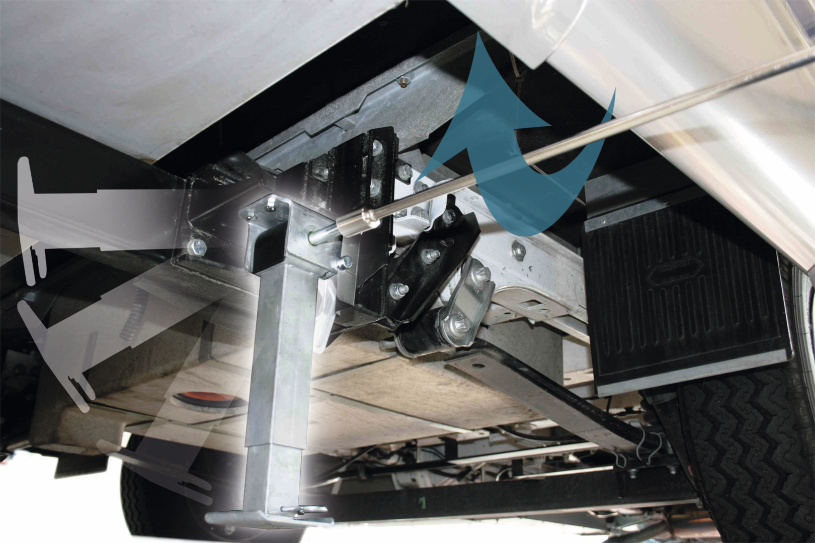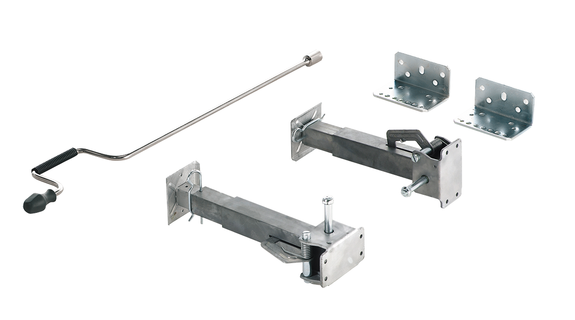 Serienmäßig mit verlängerter Kurbel (850 mm). Der Abstand zum Boden kann mittes Stecksystem schnell und effektiv angepasst werden. Stützen für die Hinterachse mit Universal-Befestigungswinkel. Maximale Hebekraft pro Stütze : 500 kg.