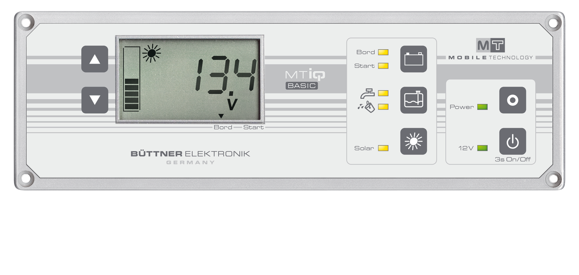 Digitalanzeige von: Start-/Bordspanung., Füllstand von Frisch-/Abwasser.