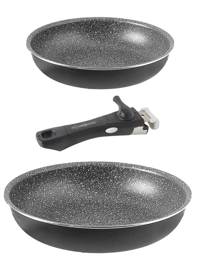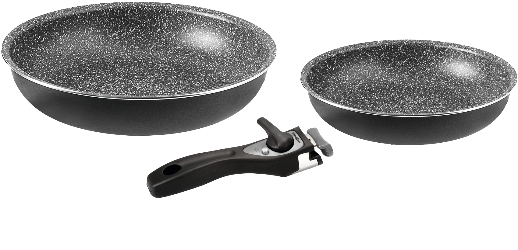 3-teiliges Pfannenset bestehend aus 1 Pfanne ø 28 cm, 1 Pfanne ø 22 cm und 1 Griffzange.