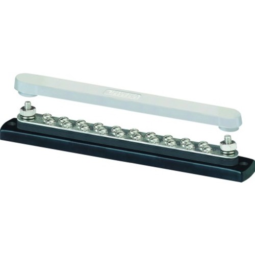 Sammelschiene mit 20 Verbraucher- und 2 Zuleitungsanschlüssen. Sehr gut geeignet zum Verbinden der Minusanschlüsse in größeren Anlagen. Passende Abdeckung AMS 22 aus Kunststoff zum Aufstecken auf die Schraubbolzen.