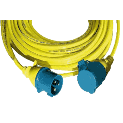Fertig konfektioniertes CEE-Verlängerungskabel mit angespritzten CEE-Kupplungsstecker und -dose mit Schutzdeckel. Hochwertige gelbe wetterfeste.