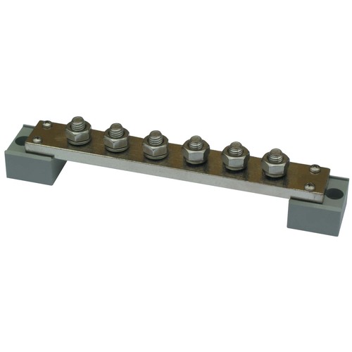 Hochwertige Minuspol-Sammelschiene für große Querschnitte. Geeignet zur Verteilung von Batteriezuleitungen und Kabelabgängen für Ankerwinden, Bugstrahlruder und weiteren Verbrauchern. Der Nennquerschnitt der Schiene beträgt 300 mm². Galvanisch vernickelte Kupferschiene auf Kunststoff-Isolierstützen montiert