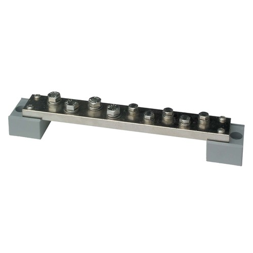 Hochwertige Minuspol-Sammelschiene für große Querschnitte. Geeignet zur Verteilung von Batteriezuleitungen und Kabelabgängen für Ankerwinden, Bugstrahlruder und weiteren Verbrauchern. Der Nennquerschnitt der Schiene beträgt 300 mm². Galvanisch vernickelte Kupferschiene auf Kunststoff-Isolierstützen montiert