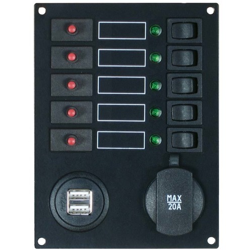5 Stromkreise mit thermischen Schutzschaltern 8 A, Leuchtdiodenanzeige, Wippschaltern und DC- und USB-Doppel-Lade-Steckdose.